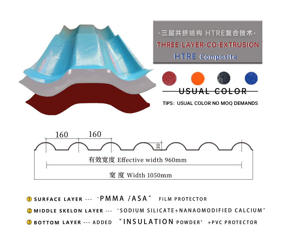 The surface layer ASA/PMMA film has excellent features,such as good weather resistance 、 strongly physical and mechanical properties. It is covered on the surface of the tile to resist various invasions such as ultraviolet rays, wind and acid, alkali and salt substances in the natural environment, and enhance the structural stability the tile under the environment of frequent alternation of high and low temperatures from -40° to 80°. And the fading rate is very low.